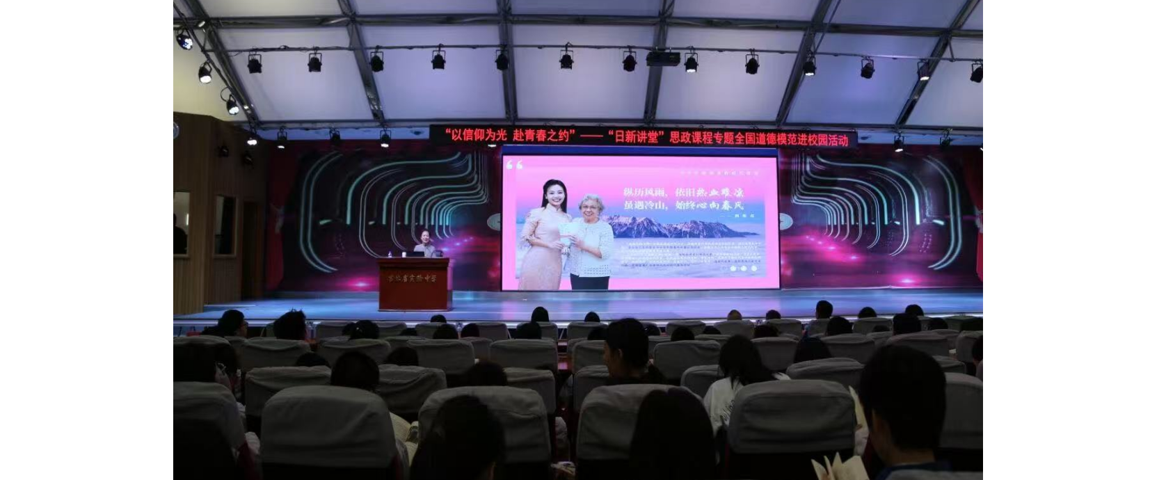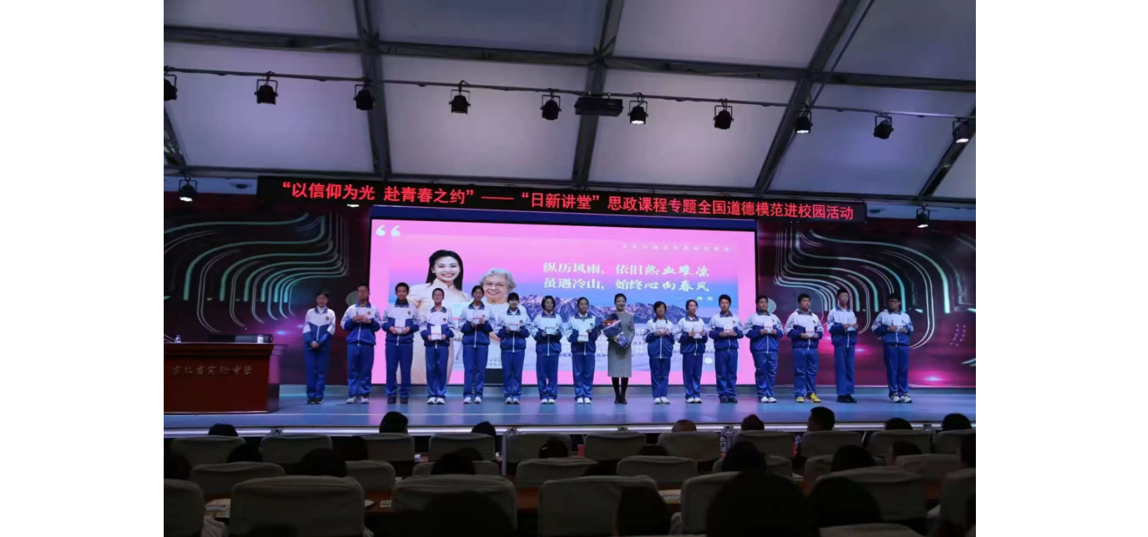在签名赠书环节,青马学员主动为排队学生传递书籍,并用自身参与志愿服务、理论学习的经历,向中学生们诠释 “坚持与热爱” 的意义,将青马精神与榜样力量深度融合。当 “星光致敬梦想”环节开启,青马学员与全场师生齐呼 “梦想超凡,青春同行”,用青春共鸣传递奋斗信念。