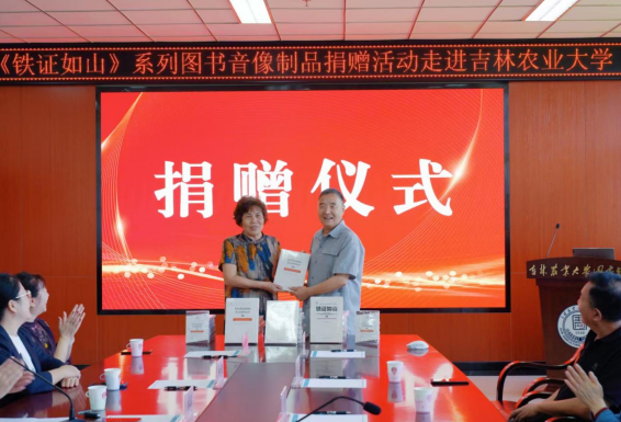 吉林出版集团译文事业部副总经理郑德民同志向吉林农业大学赠送《铁证如山》系列图书。