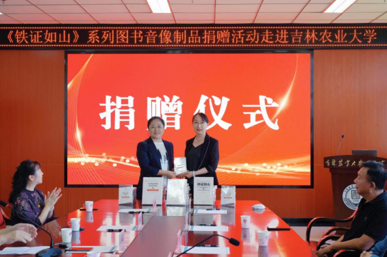 吉林音像出版社副总编辑贺谊同志向吉林农业大学赠送《铁证如山》系列音像制品。