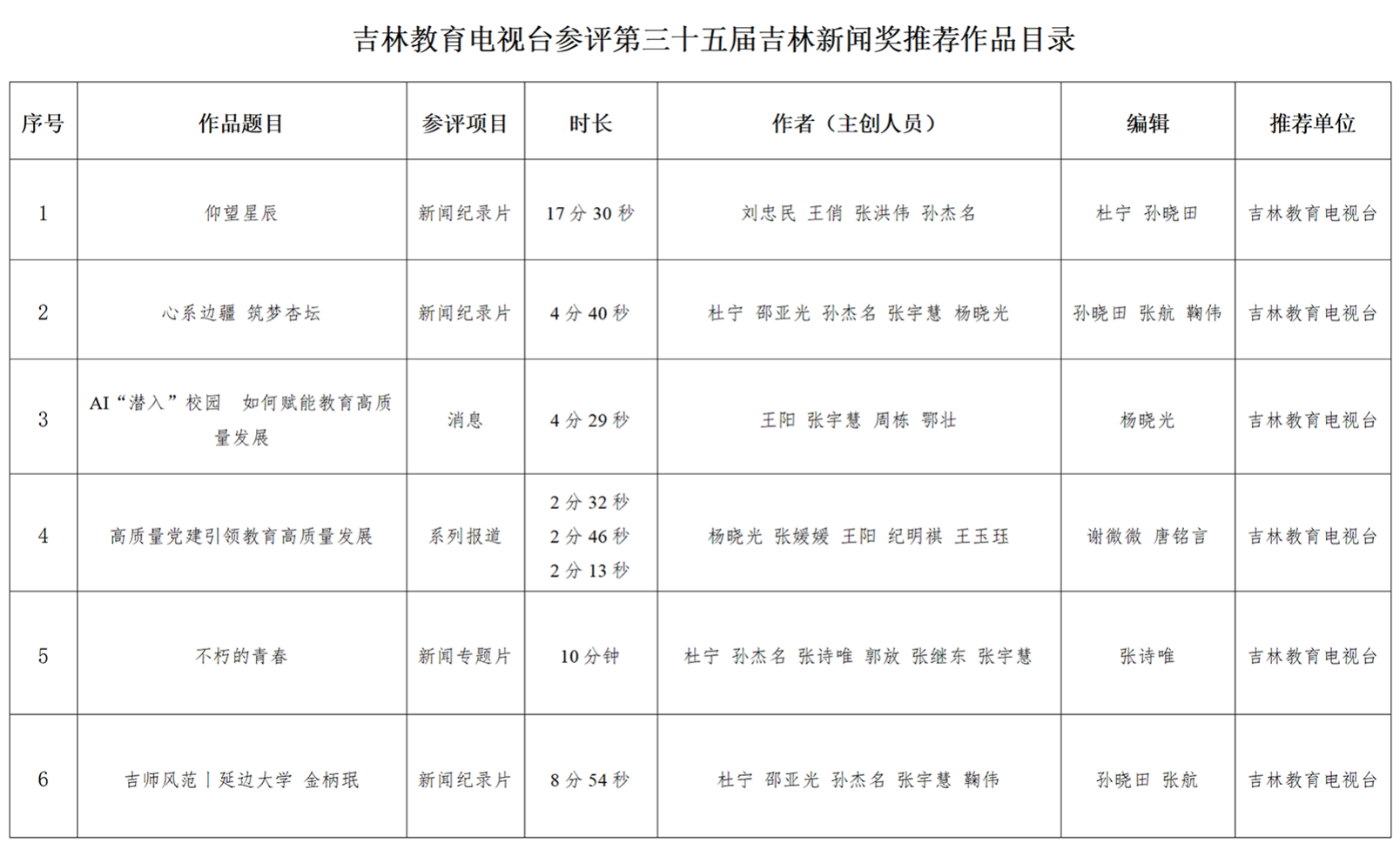 吉林教育电视台自今日起,在吉林教育电视台官方网站公示第35届吉林新闻奖参评作品,欢迎监督、评议。根据《吉林新闻奖报送通知》关于公示时间不少于3个工作日的规定,本次公示至2月25日结束。在此期间,如对推荐作品有异议,可在公示期间如实反映。