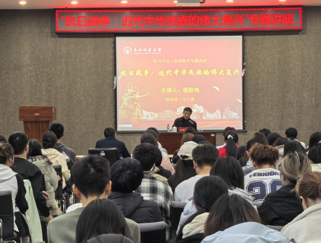 为纪念中国人民抗日战争暨世界反法西斯战争胜利80周年,持续加强对青年学生的思想政治引领,2025年10月22日,校关工委指导青马学会开展“抗日战争:近代中华民族的伟大复兴”专题讲座。讲座特邀关工委“老教授报告团”成员、东北师范大学马克思主义学部教授程舒伟担任主讲。校关工委主任马晓燕、常务副主任孙建智、副主任李全、特聘教师徐宽、校团委相关负责人员、青马学会成员及部分学院本科生近170人参加了活动。