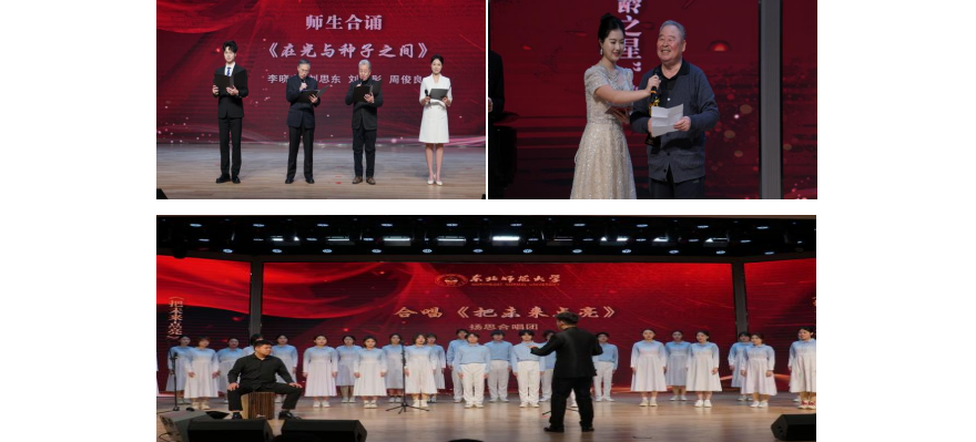 典礼上,学校为投身“银龄教师行动计划”的教师代表胡晓研、刘云发授予“银龄之星”奖杯,为2025年暑期支教原创作品获奖学生颁发证书与奖杯。教师李晓东、刘思东与学生代表共同演绎诗朗诵《在光与种子之间》,深情诠释了教育精神的薪火相传。学校扬思合唱团倾情献唱《把未来点亮》,全体师生齐唱《师德公约》,现场气氛庄重热烈。